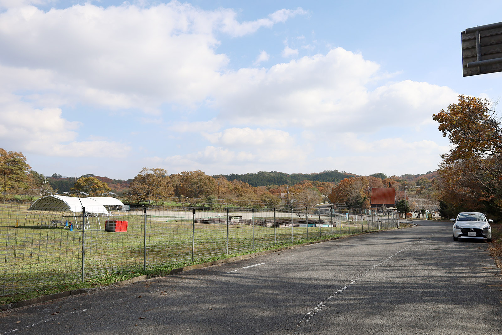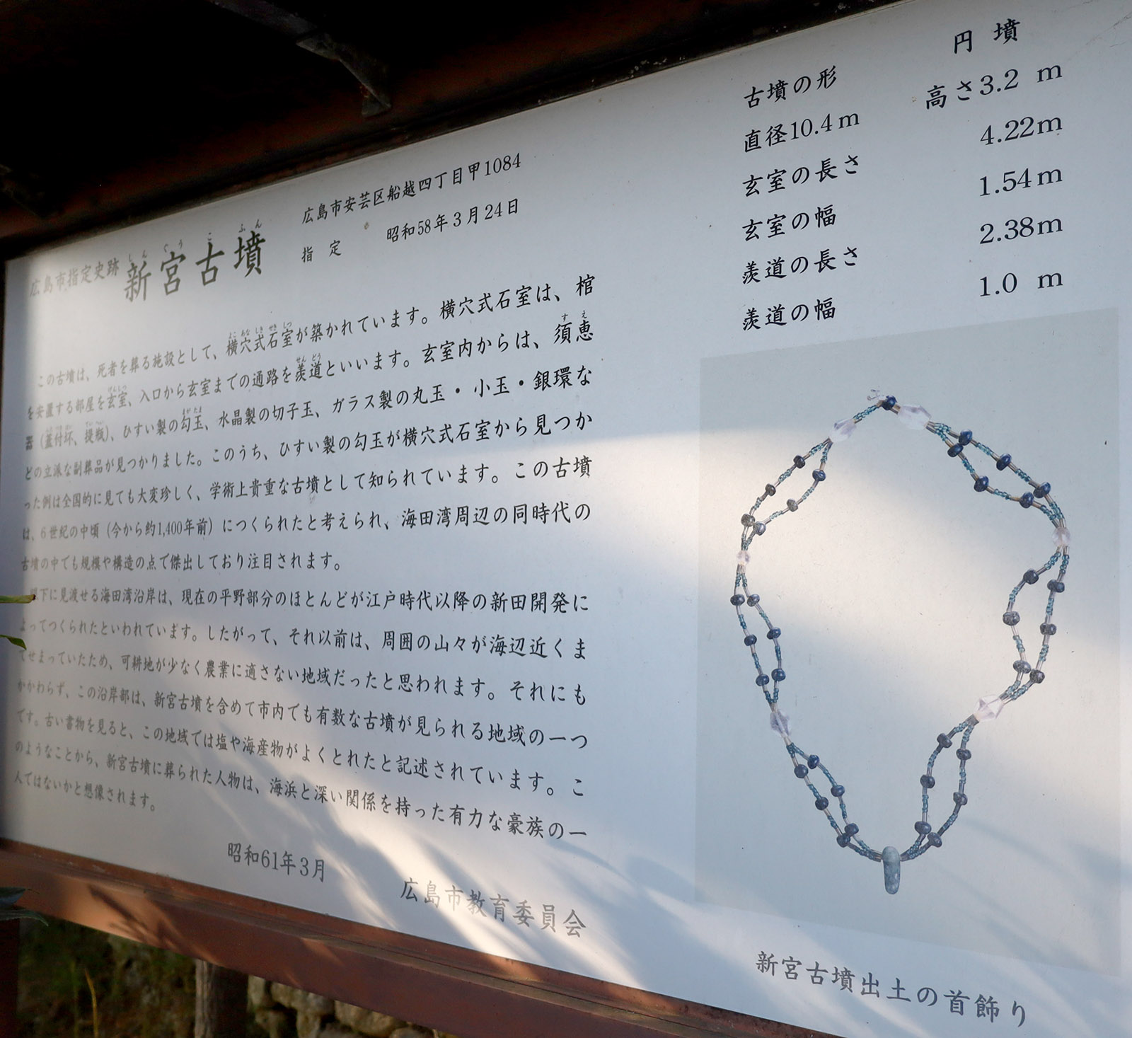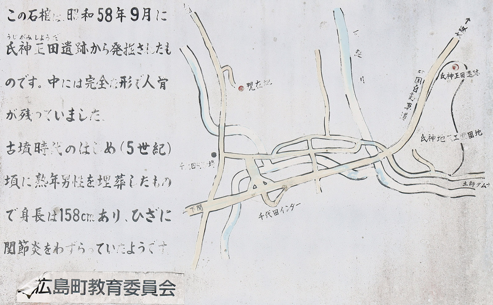 説明板は、運動公園内ではなく、運動公園駐車場入口に向かって左側の道路沿いにある。遺跡の方向に向けて立てているため、駐車場入口から見ると白い裏面が見える。