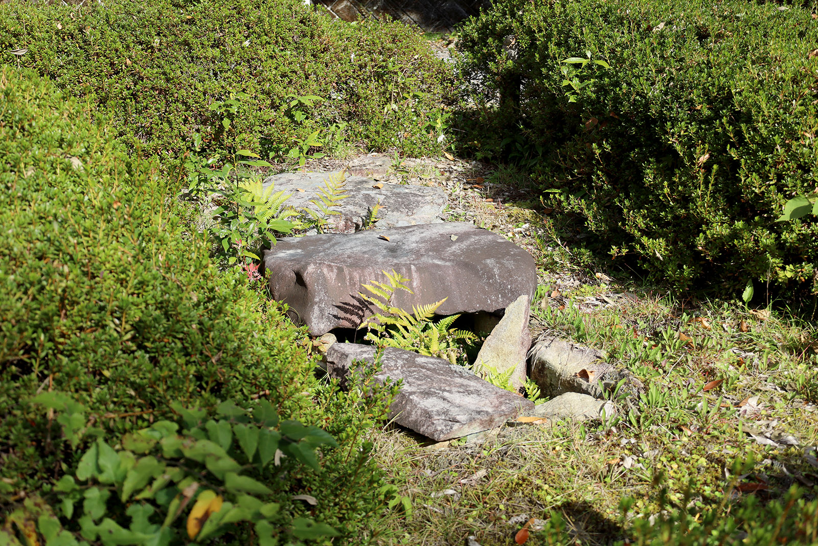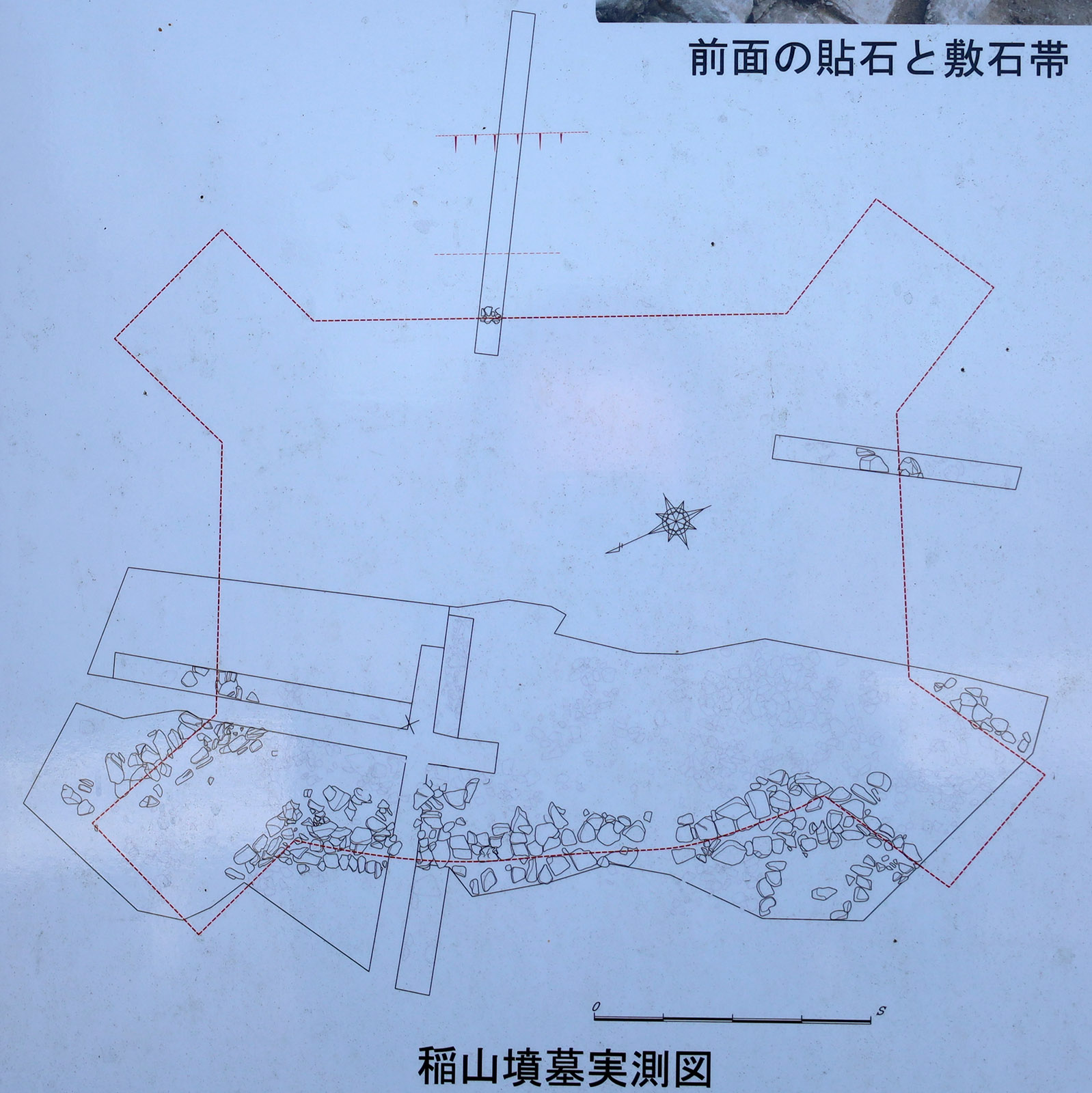 墳丘の北側斜面には濃密に、東西斜面にはややまばらに貼石が見られ、南側には浅い溝が見られる。