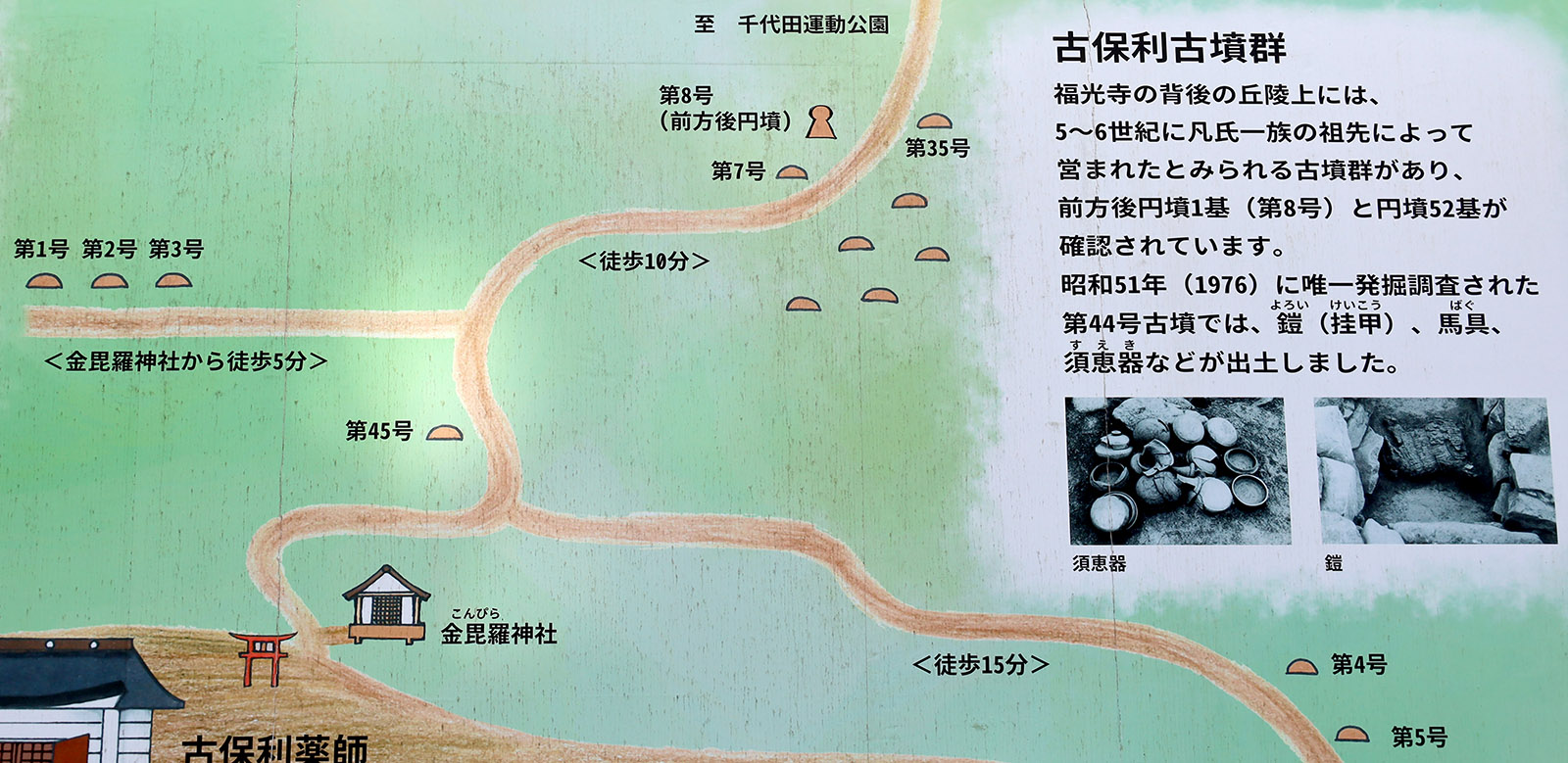 なお、見学に要する時間は、ミュージアムを出てからメインの園路から大きくそれずに、園路近くの古墳だけを見学して、浄楽寺12号墳まで行って元来た道をミュージアムまで引き返すという最もミニマムな歩き方で1時間15分くらい掛かる。