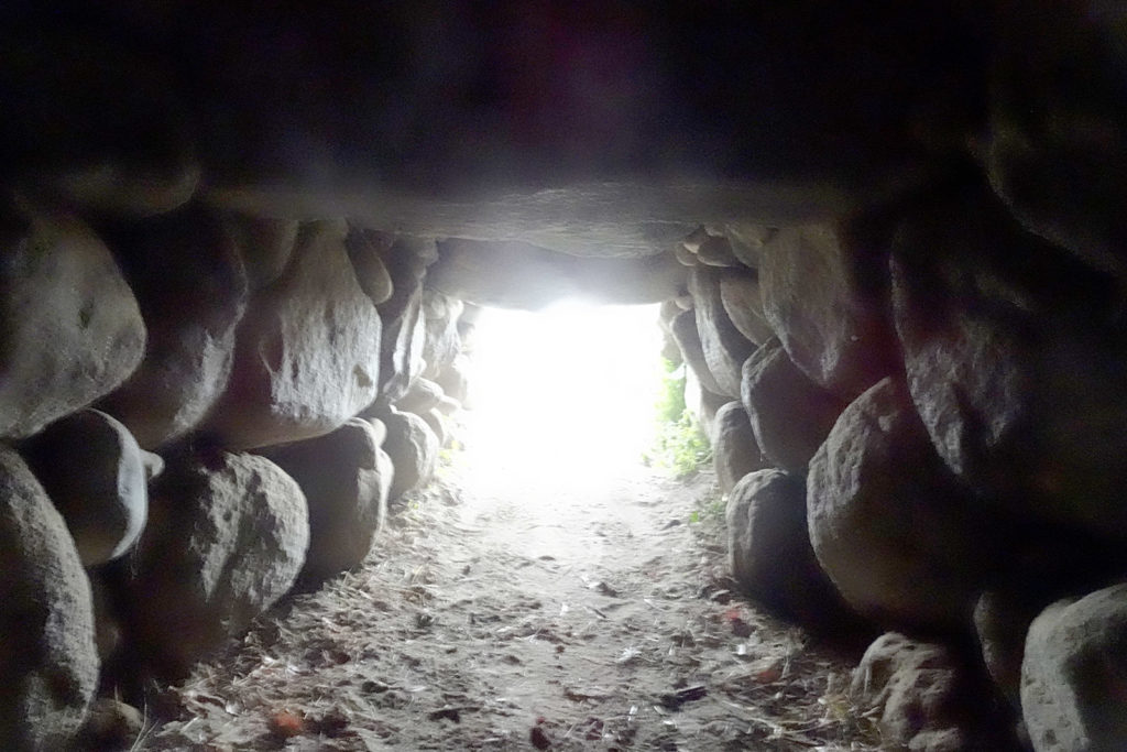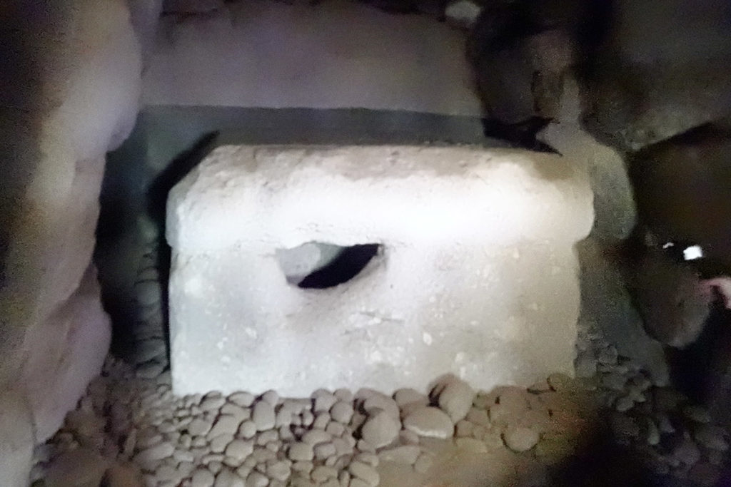 石室は玄室のみのワンルームのような構造で、「ハ」の字に開いた前庭部を持っています。玄室長は3m、幅は2.6mで、壁面と天井は一枚の巨大な石で組まれており、その精巧さには圧倒されます。玄室壁面を白い漆喰で塗布しており、今でもその形跡が見られ、玄室入口の天井部分には、格狭間状の割り込みが施されています。玄室には牛伏砂岩製の棺台らしきものが残されています。