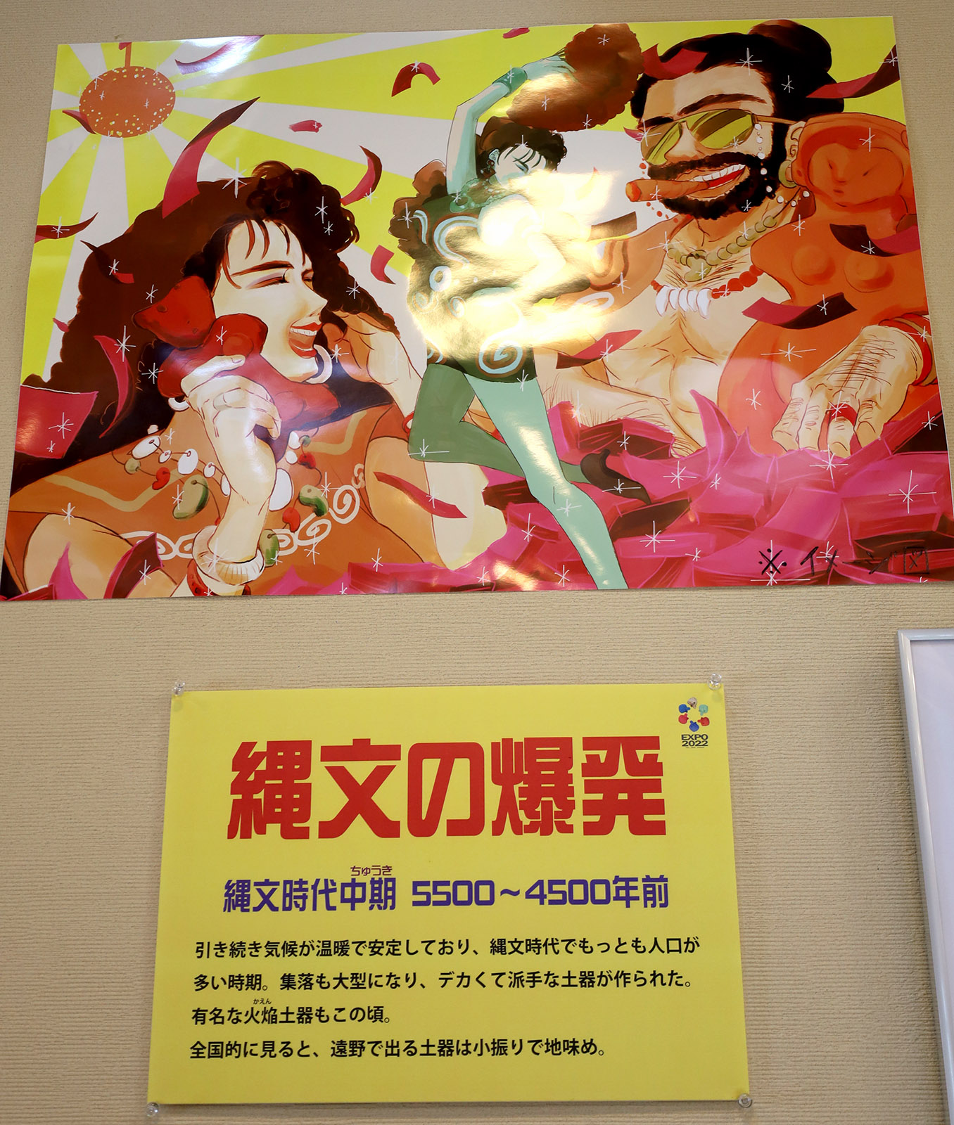 右手の富裕な男性が抱きかかえている土偶は国宝の「縄文のビーナス」をイメージしていると思いますが、当該土偶は中期の所産なので、この画は時代考証に耐え得ると思います。ただし、中期のミラーボールはまだ出土していません。
