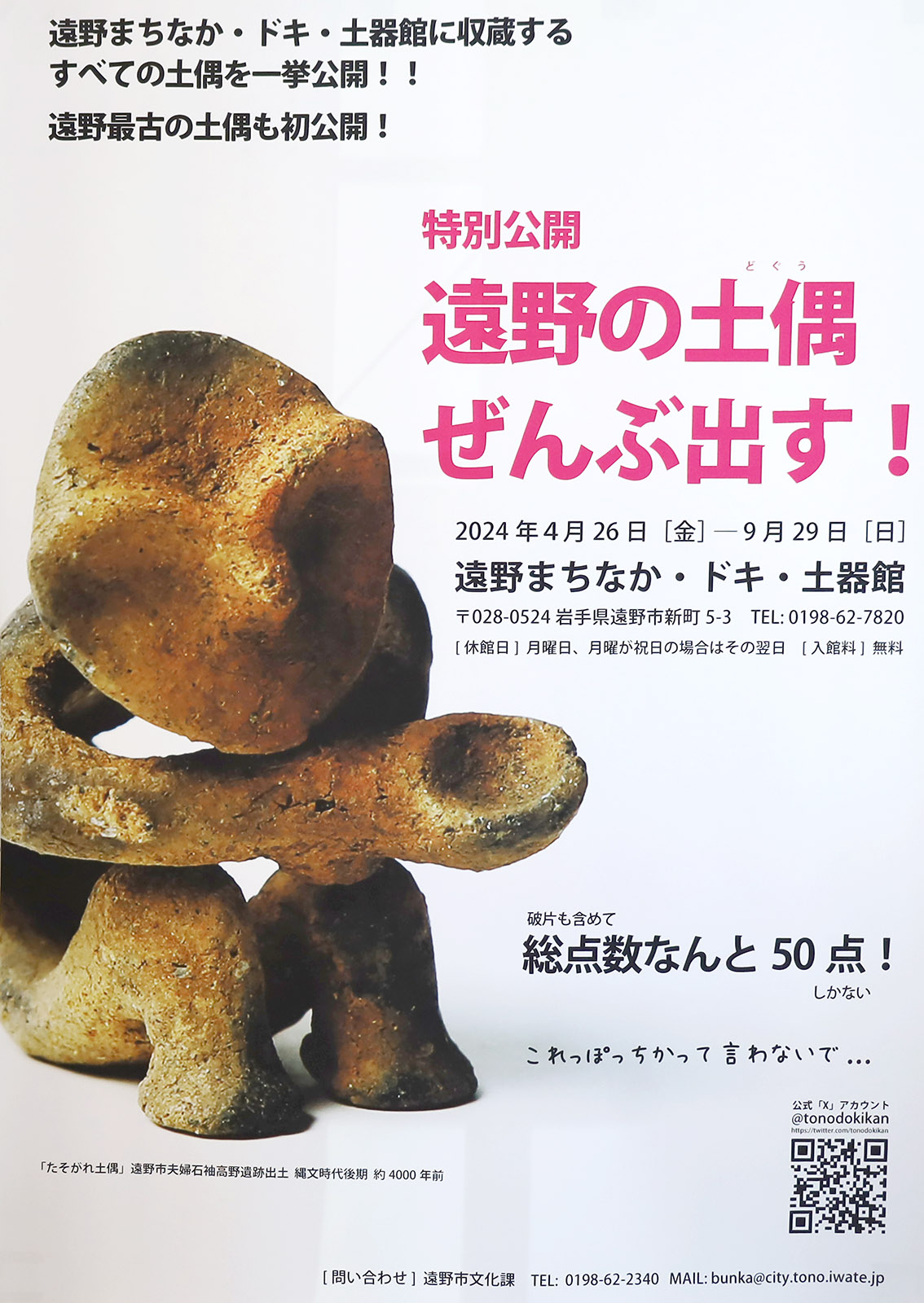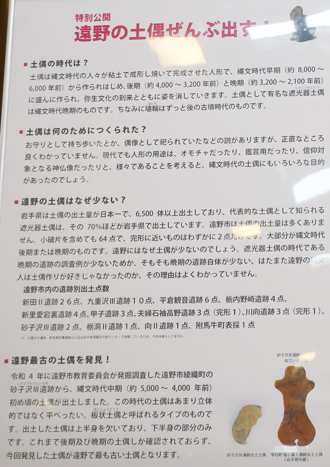 岩手県というと土偶が多い(とくに晩期)イメージがありますが、遠野市内で見つかったものは小破片を含めて64点ということで意外と少ないです。