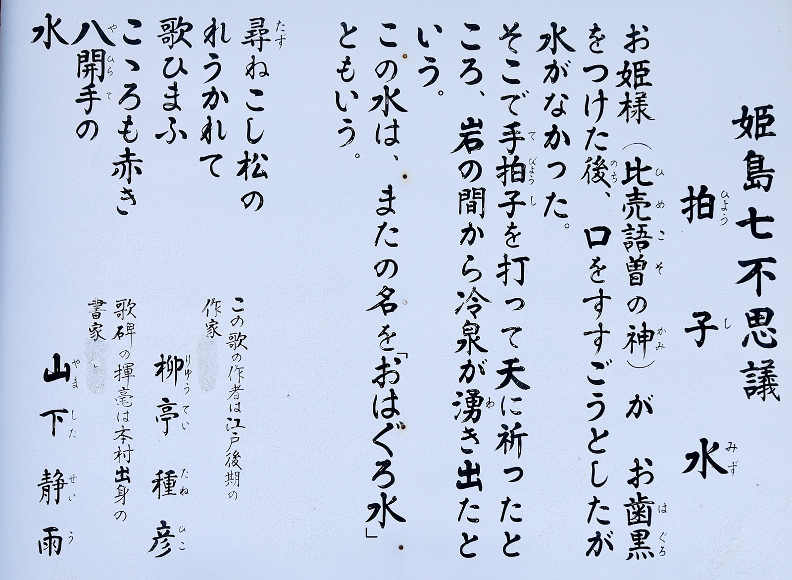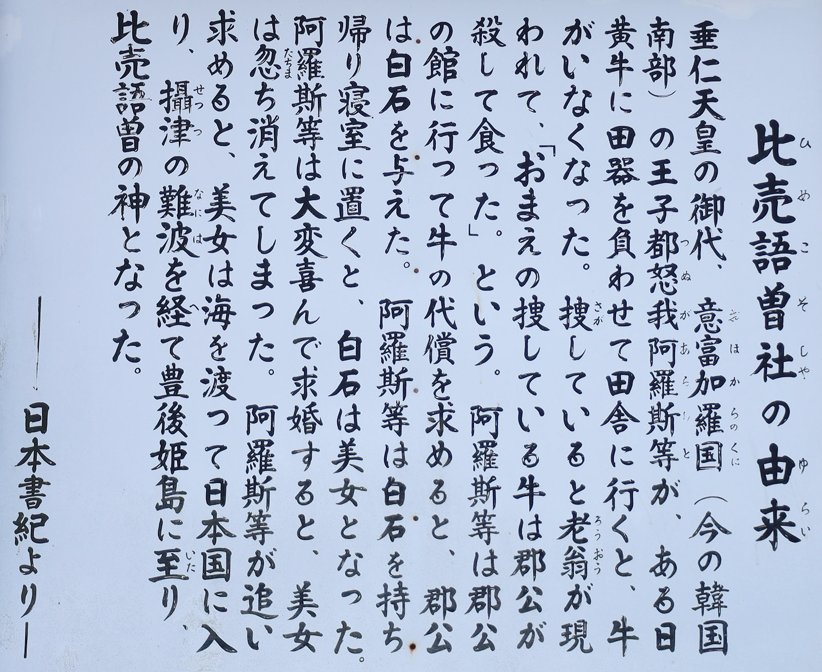 朝鮮の都怒我阿羅斯等(つぬがのあらしと)は、飼っていた牛が奪われ、その償いとして白石をもらったが、その白石は美女に変化した。都怒我阿羅斯等は喜んで性交に及ぼうとしたが、美女が逃走を図ったため、それを追って日本にやってきた。美女は難波と豊国の国前郡で比売語曽社の神となり祀られた。