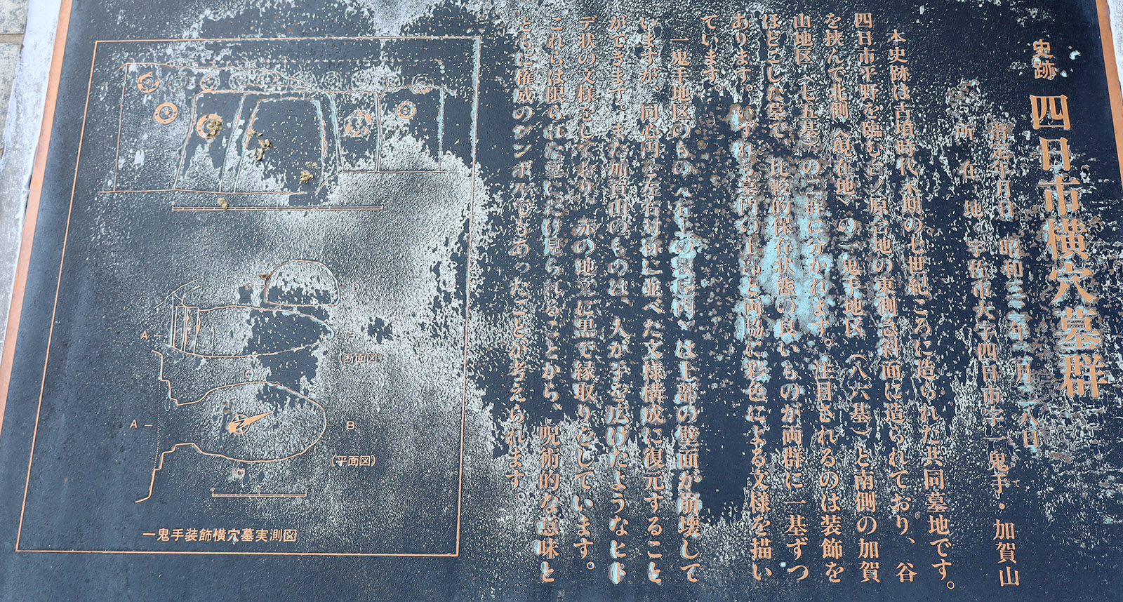 80基以上からなる一鬼手横穴群と70基以上からなる加賀山横穴群から構成される。6世紀後半から7世紀にかけて造営された。それらのうち、一鬼手横穴群の1基と加賀山横穴群の2基は、赤色顔料による文様が施されている。