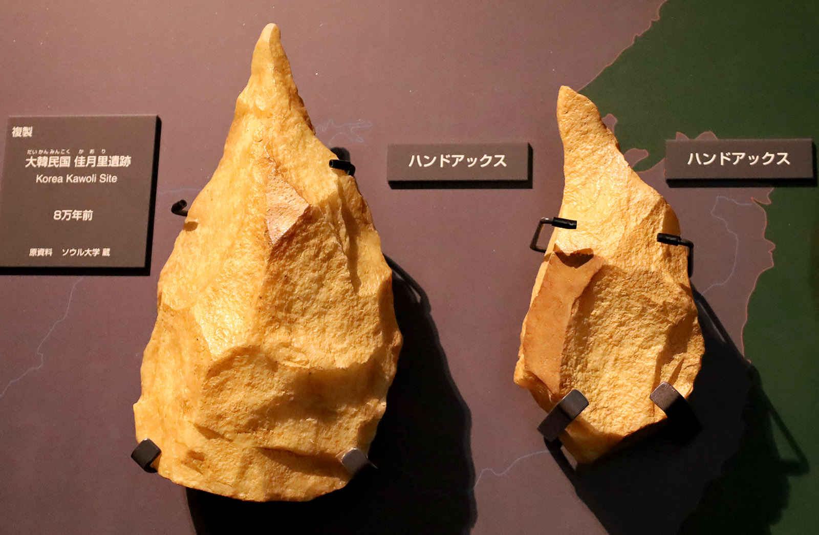 例えば、宮城県多賀城市の東北歴史博物館には、韓国の佳月里遺跡で出土した8万年前のハンドアックス(握り斧)のレプリカを展示しています。左側の物は私の手では握れないと思われるくらいに大きいです。
