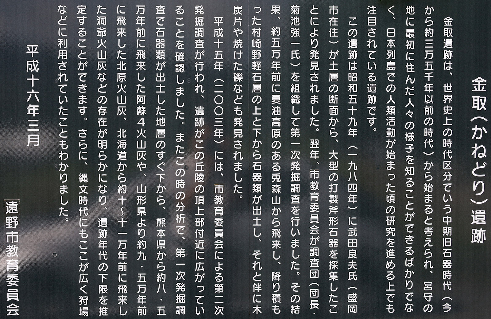 金取(かねどり)遺跡は、岩手県遠野市にある遺跡で、9~8万年前の人類の足跡があるとして、東北における最古の遺跡として紹介されることがあります(でも実際は、上述の富山遺跡のほうが古いですね)。