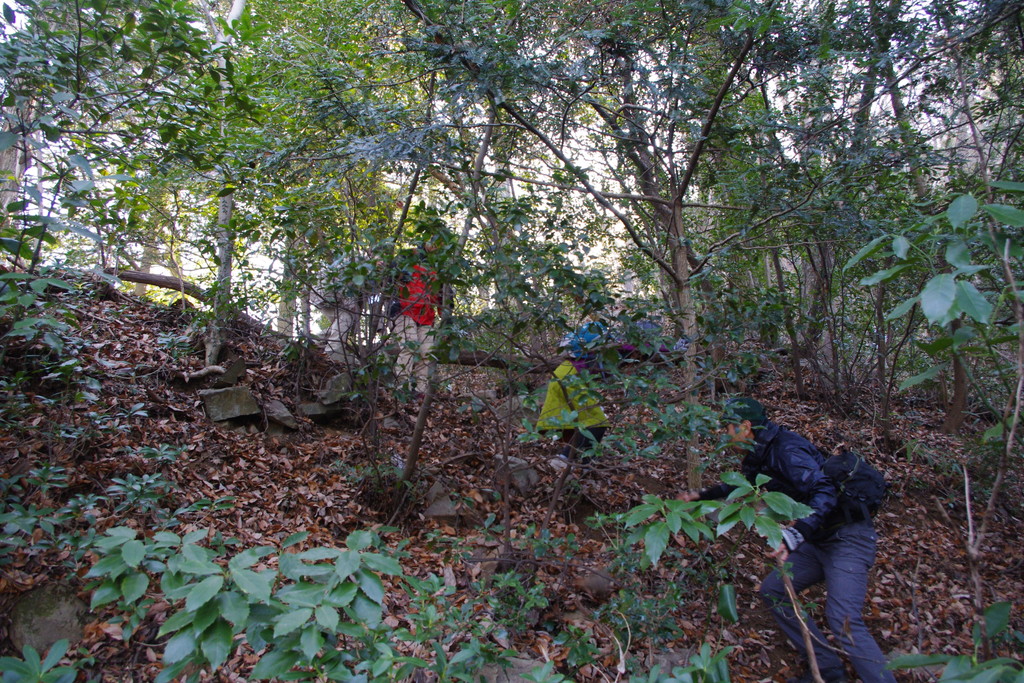 本城曲輪から北側に連なっている曲輪を藪こぎして直に降りて行くと近道なんですが、まさかそんなことを皆さんに強要することはできませんので、元来た道を戻り、太鼓曲輪の東側からハイキングコースをたどって下山します。