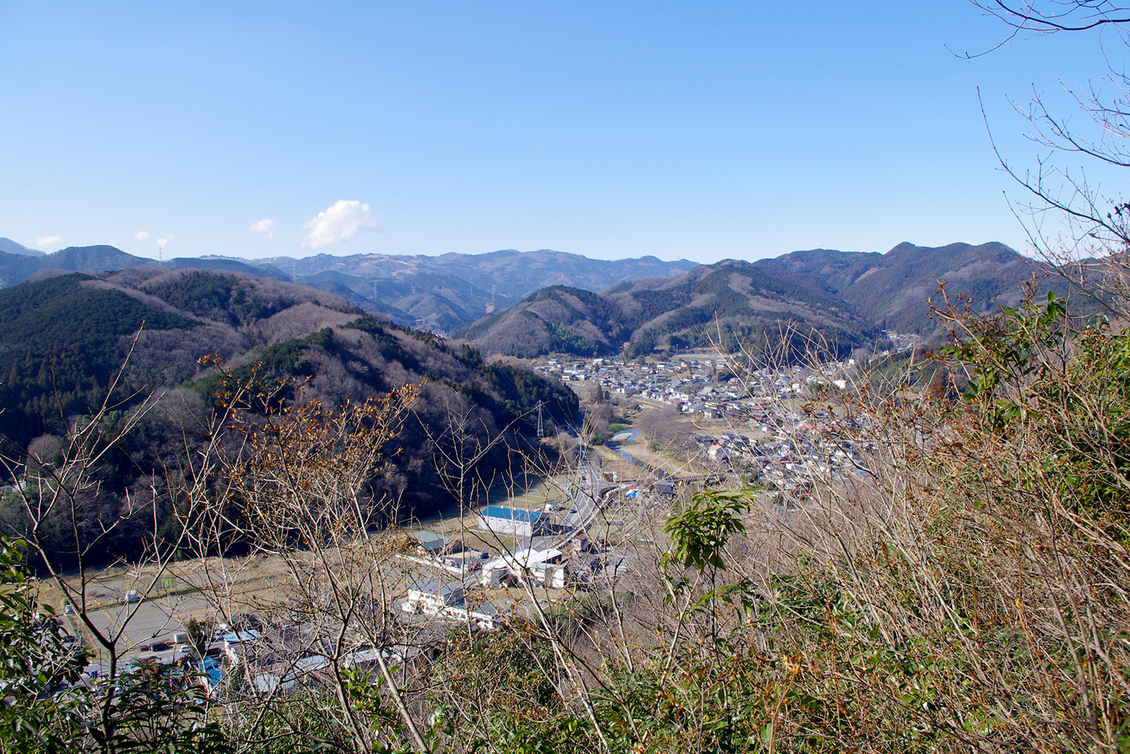 東側の眼下には小川の町場が見え、その先右手には青山城が見えます。