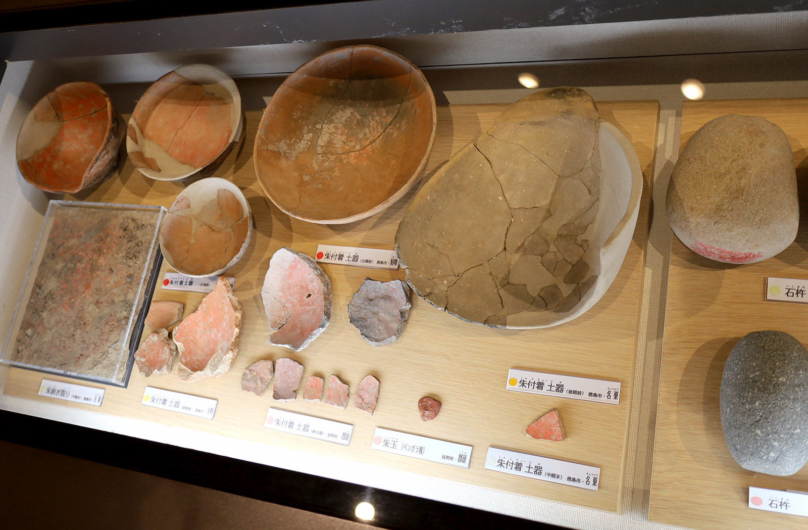 縄文土器の展示もあるが、弥生土器のラインナップが凄い。朱に関する展示も豊富。