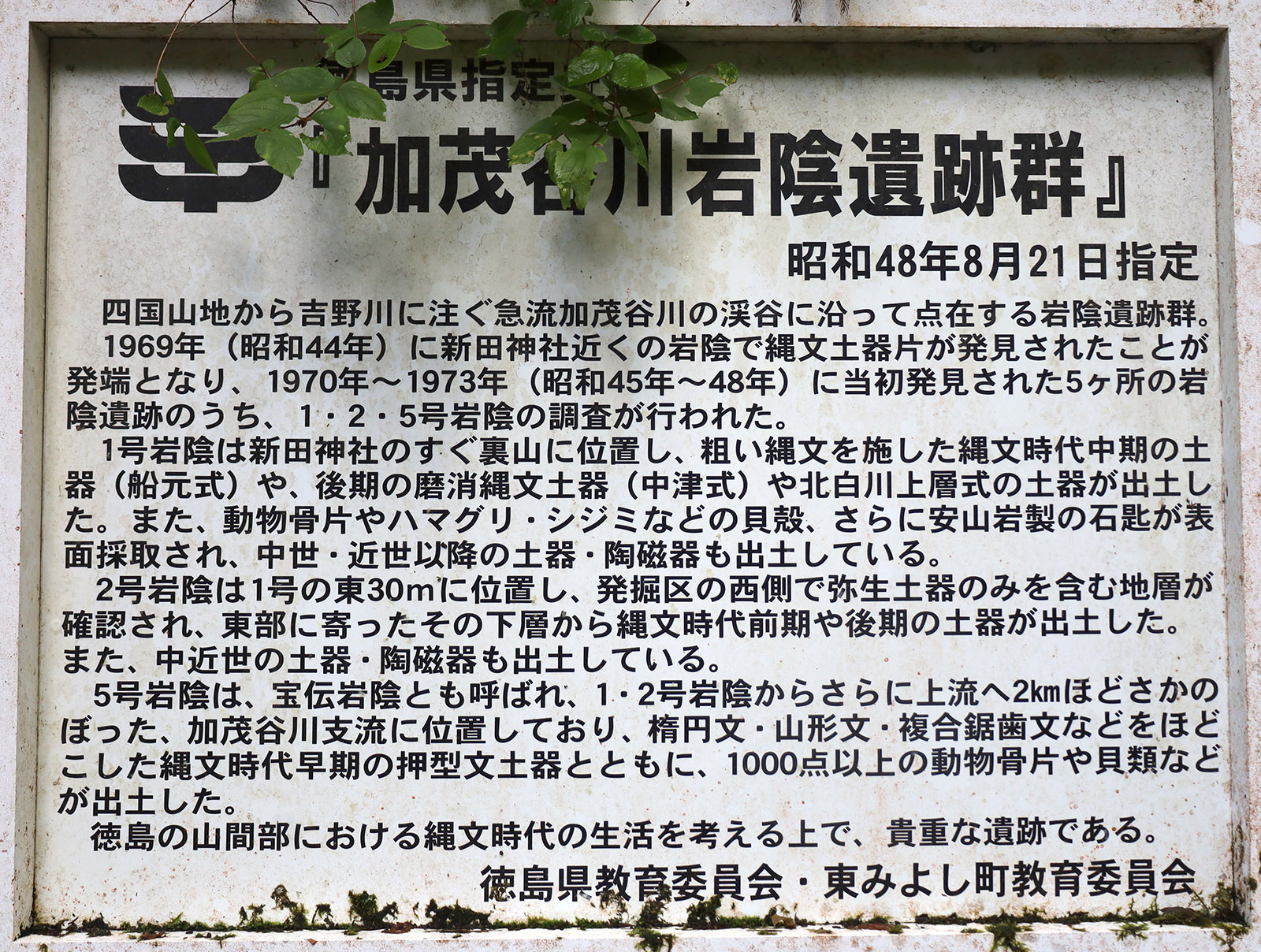 1号岩陰は新田神社のすぐ裏側にあり、2号岩陰はそこから東に約80m、比高差15mの地点にあるが、5号岩陰は上流へ2㎞ほど遡った場所にある。出土遺物は、東みよし町立歴史民俗資料館に展示している。