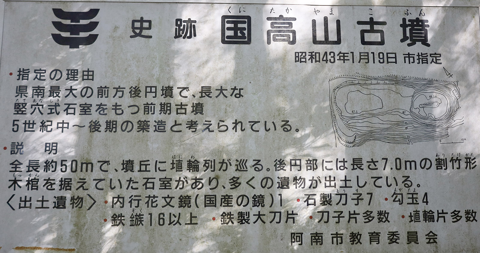 4世紀後半に築造された前方後円墳。今までは徳島県南部で唯一の前方後円墳とされてきたが、2024年、海陽町で墳丘長50mの前方後円墳(仮称多良古墳)が見つかった(これにより県内の前方後円墳の数は16基となった)。
