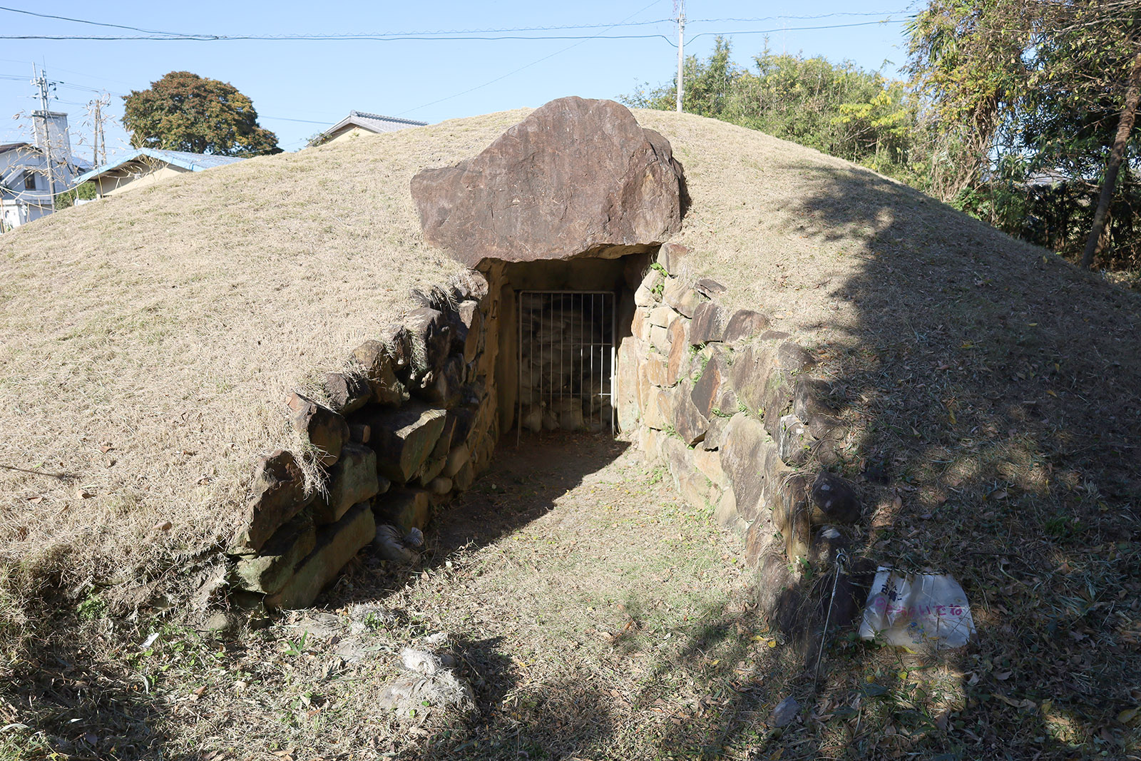 径20m、高さ7mの円墳。全長9.2mの段の塚穴型の横穴式石室を備える。玄室の奥壁には巨石を置き、石棚が造りつけられている。