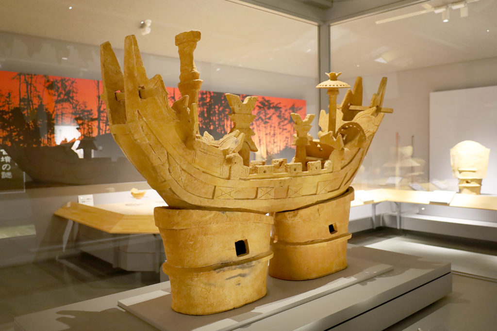 国宝船形埴輪は長さが140㎝もあり、平成17年現在、全国で見つかっている43個の船形埴輪のなかで最大を誇り、唯一の装飾を備えた船形埴輪です。2024年に国宝に指定されました。他の船形埴輪と違うのは、船の上に設置された刀、儀仗2本、そして王の場所を示す傘などが見つかったことで、当時の船の様相がよく分かり大変貴重です。