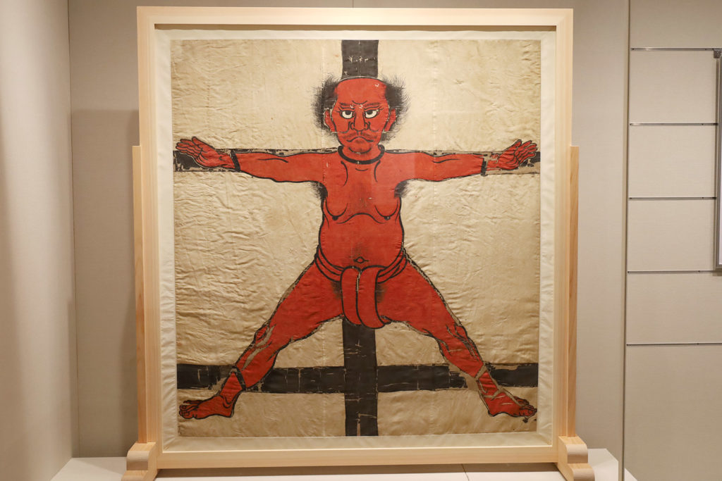 下図は、家康家臣・落合道次の背旗。道次は強右衛門の磔を目撃しており、その後、この旗を背中に掲げて戦ったといわれています。旗には血しぶきのような形跡があり、調査の結果、血痕である可能性が高いそうです。