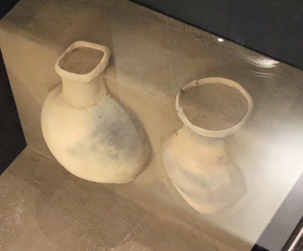 早期前葉には、52軒の竪穴住居跡が2条の道筋に沿って造られました。屋外の調理施設と思われる39基の集石や16基の連穴土坑が見つかっています。早期後葉には、壺型土器や鉢形土器を埋めた11か所の土器埋納遺構や石斧埋納遺構が見つかり、何らかの祭祀が行われていたと考えられています。壺形をした土器としては初期のもので珍しく、しかも煤が付着しているものもあり深鉢のように火にあてて使ったのかもしれません。丸い口と四角い口の壺形土器が仲良く並んで埋納されていた遺構も見つかっています。