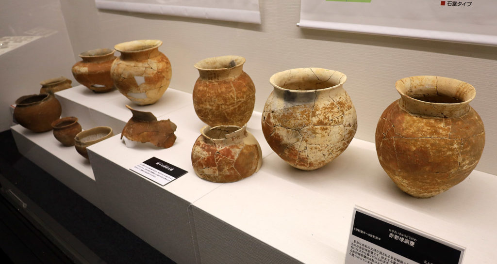 縄文土器をはじめとして豊富な考古遺物の展示があります。蝦夷(エミシ)が作った土器で、八王子からも出土している赤彩球胴甕の展示もあります(帝京大学総合博物館に展示してあるものの仲間です)。これは全国に散らばった蝦夷(俘囚<ふしゅう>)の形跡を追うために重要な土器です。