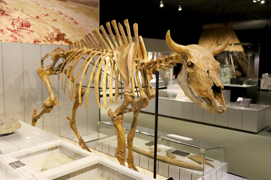 後期旧石器時代の遺跡。全国的に見ても珍しい「キルサイト」。つまり、捕獲した大型の動物を解体していた場所で、他には野尻湖畔も有名ですが、列島全体を見渡してもほとんど見つかっていない種類の遺跡です。金森遺跡とも呼ばれ、岩手県立博物館に展示している「ハナイズミモリウシ」の全身骨格の複製は、この場所から見つかりました。